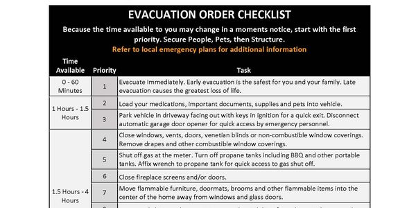 Because the time available to you may change in a moments notice, start with the first priority. Secure People, Pets, then Structure. Refer to local emergency plans for additional information.